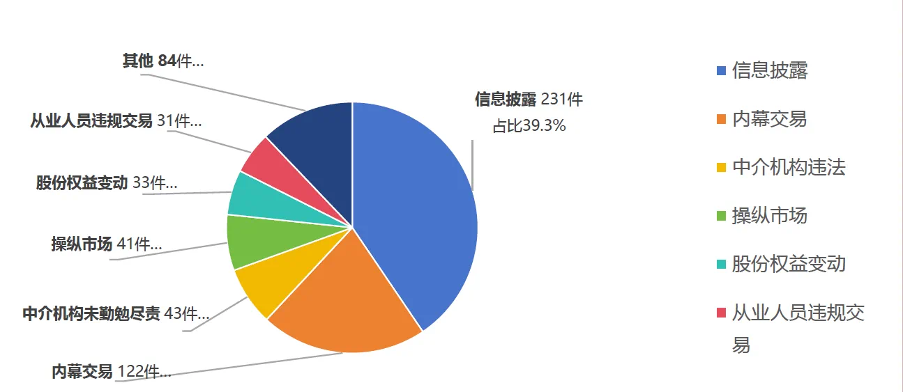 2024年,各类证券违法行为的数量均有所增加。信息披露违法、内幕交易、操纵市场仍然是上市公司及相关市场主体最易触发的违法行为,也是监管部门重点打击的对象,行政处罚数量远高于其他违法类型,信息披露违法行政处罚案件有231件(占比39.3%)、内幕交易案件有122件(占比20.8%)、操纵市场案件有41件(占比6.5%)。此外,利用未公开信息交易、借用证券账户、中介机构未勤勉尽责的案件较往年明显增多,如利用未公开信息交易的案件有19件(较2023年增加280%),借用账户的案件有19件(较2023年增加18.75%)。