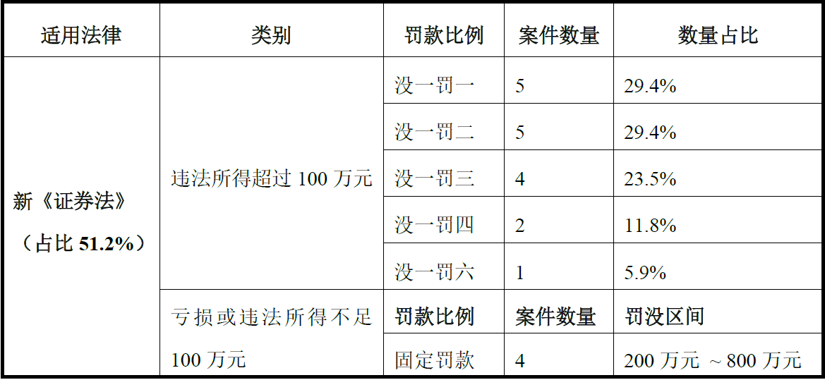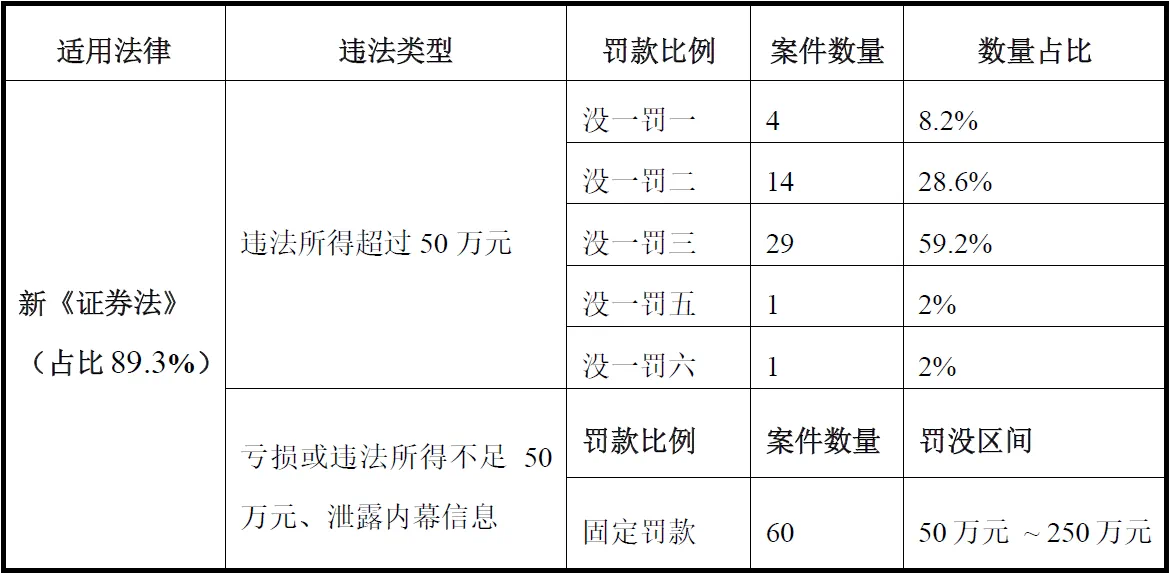 内幕交易罚没力度不断加大。2024年122件内幕交易案件中,有109件内幕交易案件系根据新《证券法》作出(占比89.3%),依照原《证券法》作出的仅13件(占比10.7%)。依照新法作出处罚的案件中,对于获利超过50万元的,根据违法程度轻重,罚没比例从一倍至六倍不等,一倍罚款4件(占比8.2%)、两倍罚款14件(占比28.6%)、三倍罚款29件(占比59.2%)、五倍罚款与六倍罚款均为1件(分别占比2%);对于亏损、获利不足50万元、泄露内幕信息的案件,处以固定罚金,金额从20万元至250万元不等,平均为120万元/人。可见,获利型内幕交易的罚没倍数以没一罚三为主,固定罚金的金额普遍超过百万元,内幕交易的违法后果显著上升。