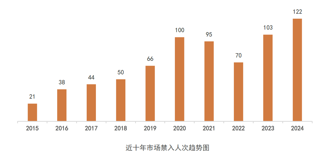 2024年,证监会(含证监局)全年对122人次的自然人采取市场禁入,与2023年的103人次相比,市场禁入的执法力度持续提升。市场禁入的年限与违法行为恶劣程度相匹配。分年限看,其中2年 ~ 5年共计58人次(占比47.5%),6年 ~ 10年共计50人次(占比41%),终身市场禁入的共计14人次(占比11.5%)。市场禁入的严厉程度与违法行为的发生频度相匹配,是“财产罚”之外的“资格罚”,对证券违法相关责任人员进行了“逐出市场”的有力打击。