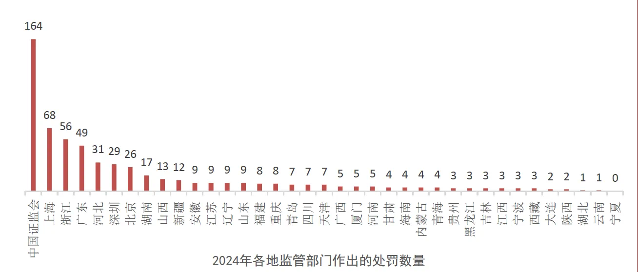 中国证监会是证券违法行为的核心监管机构,其派出机构包括36家证监局和沪深专员办,负责查办稽查局交办的或辖区内的重大案件。据公开数据统计,2024年中国证监会及36家地方证监局全年共作出593件行政处罚决定,数量再创历史新高。其中,证监会作出的处罚数量居首,共计164件;同期地方局作出处罚决定共计429件,上海、浙江、广东及深圳证监局基于其上市公司数量及经济发展情况,审结的案件数量较多,仅这四家证监局便作出处罚202件,占所有处罚数量的33.9%,占地方证监局全部处罚的46.8%,监管执法呈区域集中特征。与往年不同的是,湖南、山西、新疆三地案件数量涨幅近50%。