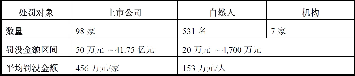 信息披露违法的行政处罚金额处于高位。2024年,231件信息披露行政处罚案件中,适用新《证券法》作出处罚的为223件(占比96.5%),依照原《证券法》作出的仅占3.5%。2024年度,有98家上市公司、531名自然人、7家机构主体因信息披露违法受到处罚。其中,对上市公司的罚款金额从50万元至41.75亿元不等(含欺诈发行案,下同),平均罚款金额为456万元/家;[注4]责任人员视所涉违法行为及情节轻重,被处以20万元至4,700万元不等的罚款,平均罚款金额为153万元/人。上市公司及“关键少数”动辄几百万的行政罚款已不再罕见,在严刑峻法的执法环境下,巨额罚款的趋势将延续。