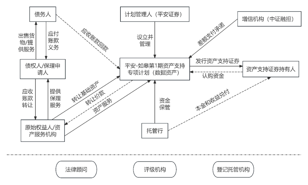 2025年4月28日,全国首单数据资产ABS产品“平安-如皋第1期资产支持专项计划(数据资产)”在深圳证券交易成功发行。本项目中,原始权益人及资产服务机构为天津安永商业保理有限公司,计划管理人为平安证券股份有限公司,基础资产为原始权益人通过保理业务购买的应收账款债权,中证信用融资担保有限公司作为信用增级机构为本项目提供差额支付承诺。本项目采取供应链金融模式,入池资产10笔,涉及债务人5个,债务人均为如皋市下属国有企业,部分基础资产附有在相关产权交易所挂牌登记的数据资产的质押担保(质押应收账款金额占全部入池应收账款金额的比例为50.46%)。