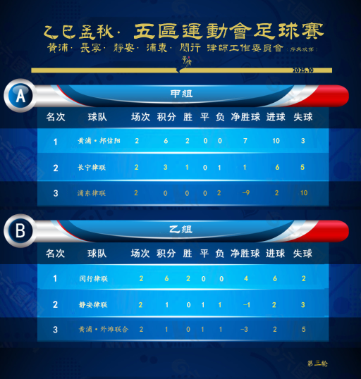 2025年10月29日,2025上海五区律师活力运动汇足球赛迎来第三轮激战。长宁律联迎接浦东律联,闵行律联迎接静安律联的挑战。两场比赛对抗激烈,且最终决定了小组出线的命运。