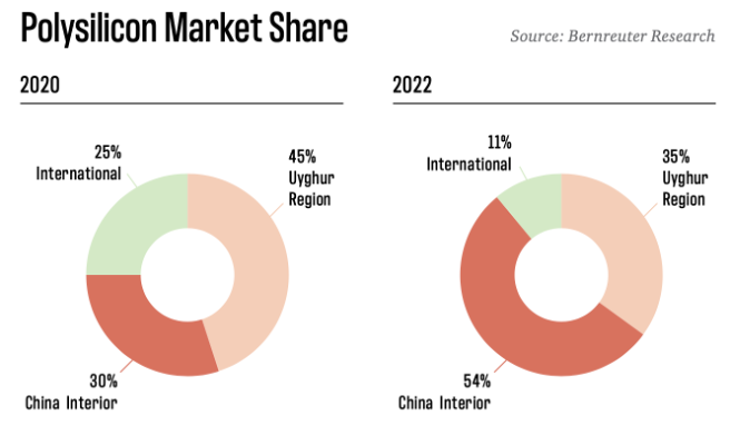 自2021年以来,一系列报告——包括谢菲尔德海尔姆大学的研究报告(我们在本系列文章中篇中提及了该高校研究报告对美国CBP和强迫劳动执法工作组(Forced Labor Enforcement Task Force , FLETF)执法方向的潜在影响)——强调了我国新疆维吾尔自治区制造业在光伏产业中的主导地位,并首次将该地区发生的事情与光伏产业供应链(特别是多晶硅的生产)联系起来。根据谢菲尔德海尔姆大学今年8月发布的最新相关报告:[10]