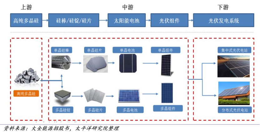 太阳能光伏制造的过程可大致分为五个环节:多晶硅(polysilicon)、硅锭(Ingot)、硅片(Wafer)、电池(Cell)、组件(Module)[6][7]。