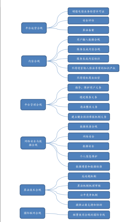 在我国当前的监管体系下,大模型合规要素主要涉及的范畴包括平台运营合规、内容合规、平台管理合规、网络安全与数据合规、算法技术合规、国际联网合规等方面,具体合规要素以及相应的法律法规依据详见下图: