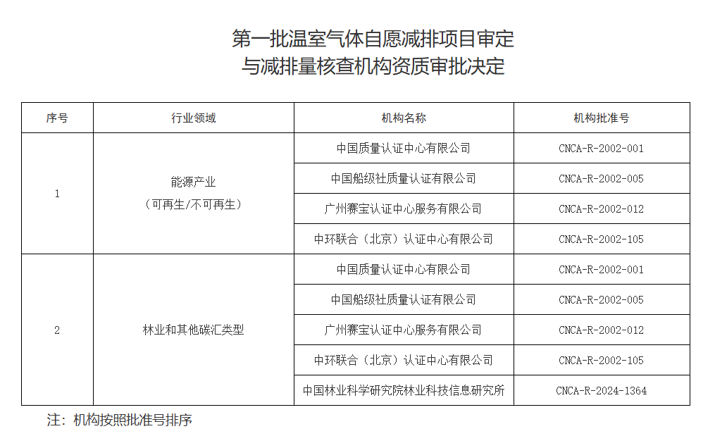 审定与核查机构系由国家认证认可监督管理委员会以名单目录方式公布具备温室气体自愿减排审定与减排量核查机构资质的实体,且根据行业领域划分其资质适用范围,属于自愿减排市场的服务机构。根据《管理办法》规定,国家核证自愿减排量备案成功的前置条件,包括需要审定与核查机构出具的审定报告、核查报告。2024年6月7日,国家认证认可监督管理委员会发布第一批温室气体自愿减排项目审定与减排量核查机构资质审批决定的公告,批准了包括中国质量认证中心有限公司、中国船级社质量认证有限公司、广州赛宝认证中心服务有限公司、中环联合(北京)认证中心有限公司、中国林业科学研究院林业科技信息研究所5家机构。值得关注的是,不同于以往核定与核查机构管理方式,此次公布的审定与核查机构,根据行业领域不同,其可以审定与核查的项目类型将存在差异。具体来说,前述5家机构,其中前4家机构即适用于能源产业(可再生/不可再生)及林业和其他碳汇类型、第5家则只能对林业和其他碳汇类型领域进行温室气体减排项目审定与减排量核查工作。具体可见下图: