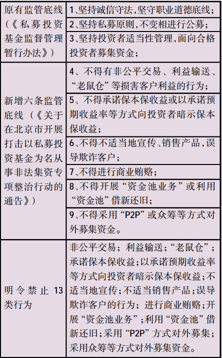 当前而言,私募基金有九条监管底线,并且有13类明令禁止行为(具体底线和禁止行为见下表)。