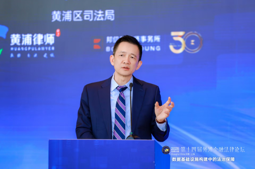 12月11日,第十四届“外滩金融法律论坛”在新天地举行。本届论坛以“数据基础设施构建中的法治保障”为主题,旨在凝聚共识,筑牢数据基础设施的法治根基,推动数字经济高质量发展。黄浦区委副书记、区长徐惠丽,市司法局党委书记、局长顾全,上海财经大学校长、党委副书记刘元春等出席论坛。黄浦区领导李铭、汤宏,上海市国际贸易促进委员会副会长、上海国际仲裁中心副主任马屹,黄浦区人民检察院检察长谈倩,市律师协会会长邵万权,市、区有关部门负责人,企业界、法律界、学术界人士等参加论坛。