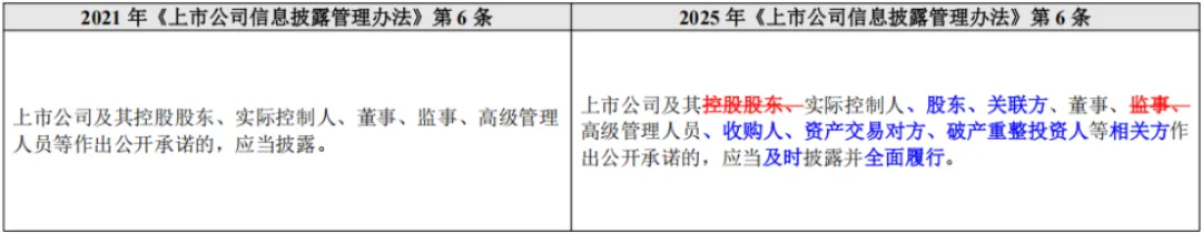 第二,扩展公开承诺主体范围。在实践中,涉及公开承诺的事项包括增减持、收购、并购重组、破产重整等,而原《信披办法》将公开承诺披露的主体限定为上市公司及其控股股东、实际控制人、董事、监事、高级管理人员,未对常见的关联方、收购人、资产交易对方、破产重整投资人等承诺主体未予规定。新《信披办法》第6条对此予以完善,新增收购人、资产交易对方、破产重整投资人等为公开承诺主体,与《上市公司监管指引第4号——上市公司及其相关方承诺》衔接。新《信披办法》覆盖更多交易场景的承诺主体,并要求及时披露、全面履行,有助于减少承诺履约漏洞,增强市场对并购重组等事项的信心及可预期性。