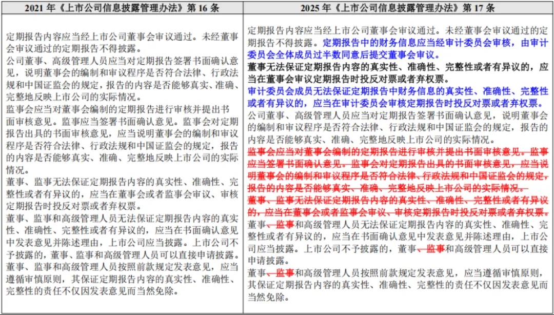 第一,删除有关上市公司监事的规定。新《公司法》于2024年7月1日正式生效,其重要修订内容之一,即股份有限公司可以按照公司章程的规定在董事会中设置由董事组成的审计委员会,行使监事会的职权,不设监事会或者监事。为落实前述规定,新《信披办法》删除有关上市公司监事及监事会的相关规定,并将原有关于监事会的责任与义务,适应地调整为审计委员会的责任与义务。(鉴于修改之处较多,此处不一一列举,详请参见《<上市公司信息披露管理办法>新旧对比表》)