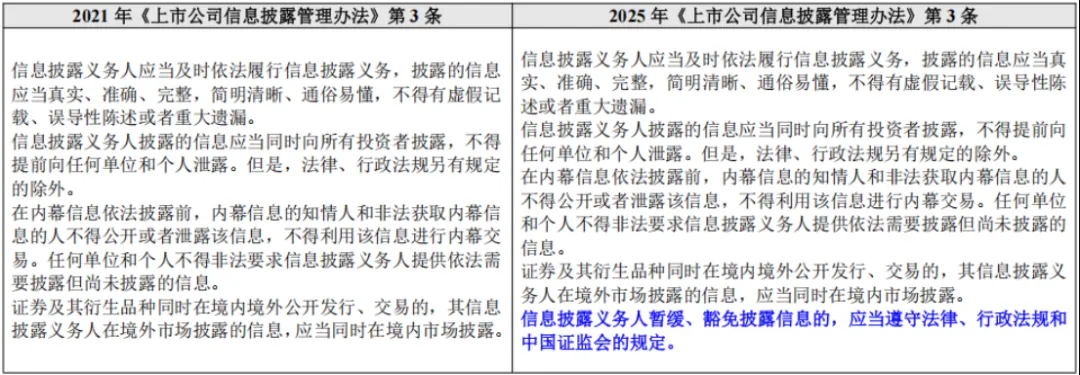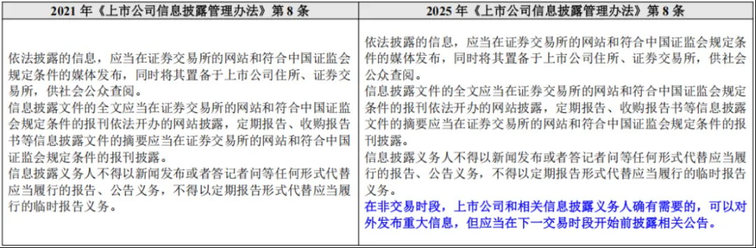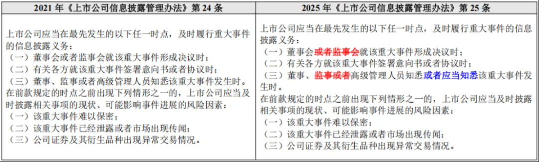 第二,调整重大事项披露时点。新《信披办法》第25条将披露触发时点从“董事、监事或高管知悉该重大事件发生时”修改为“董事或高管知悉或应当知悉该重大事件发生时”。该条进一步强化披露重大事件的及时性要求,压实董事、高管履职责任,避免公司管理人员以“不知情”作为上市公司未及时披露重大事件的借口。