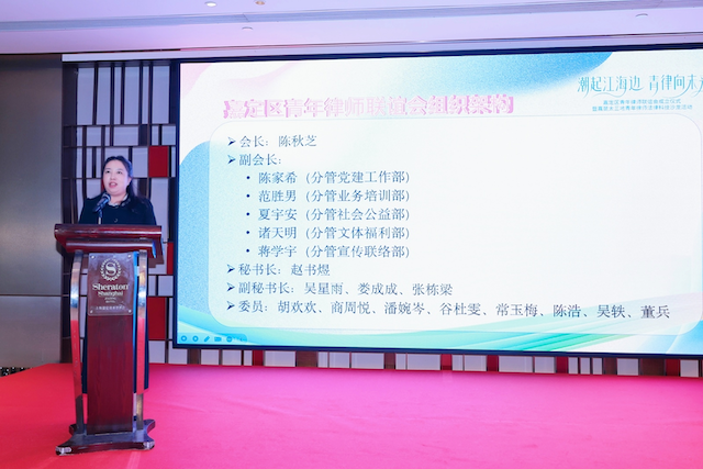 嘉定青律联首任会长陈秋芝律师在成立大会上做履职发言:嘉定青律联的核心使命,就是以 “凝聚青年力量、赋能执业成长、服务法治嘉定” 为初心,为全区 40 周岁以下的青年律师搭建一个可以共享执业经验、共解业务难题的平台,携手传承法治精神、共担社会责任。2026年,嘉定青律联将以党建为引领,让红色基因融入执业血脉,打造有辨识度的党建品牌;以专业为根基,聚焦大家最关心的实务需求,帮助青年律师快速提升执业本领;以公益为纽带,走进工商联、养老机构、社区、学校,彰显青年律师的责任担当;以文体为桥梁,通过社团活动、文体赛事,让青年律师放松身心、增进友谊,真正感受到青律联的归属感;以宣传为窗口,讲好嘉定青年律师的故事,让更多人看到嘉定青年律师 “专业、担当、活力” 的良好形象。