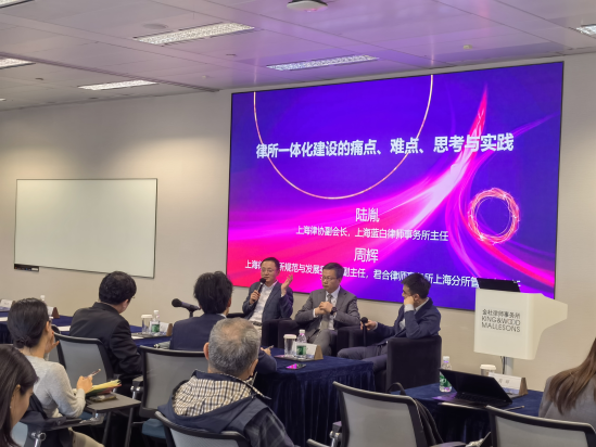 上海律协副会长、上海蓝白律师事务所主任陆胤和规发委副主任、君合律师事务所上海分所管委会主任周辉作为与谈嘉宾,分别分享了各自律所在一体化建设中的经验和特色。