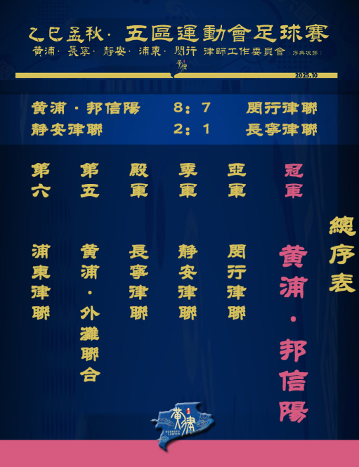 2025年11月12日,2025上海五区律师活力运动汇足球赛迎来最终决战。黄浦·邦信阳挑落实力强劲的闵行律联,经过紧张艰苦的点球大战逆转战胜对手,勇夺桂冠。